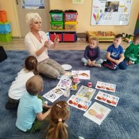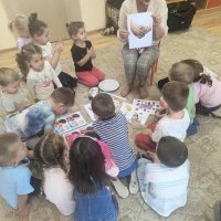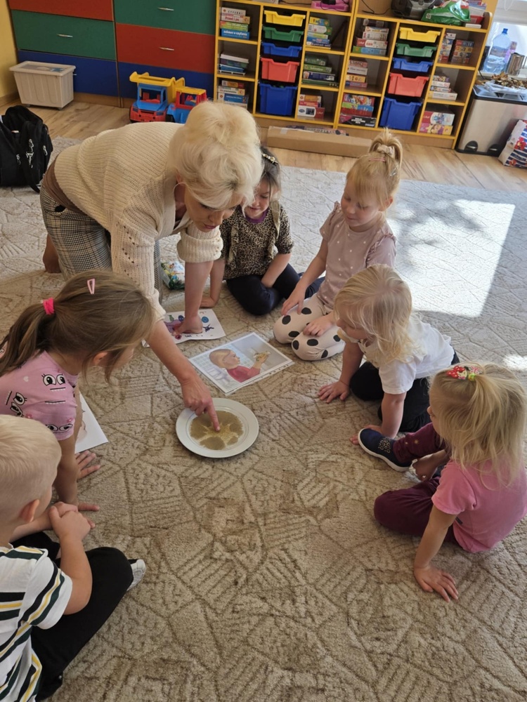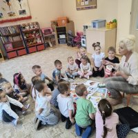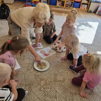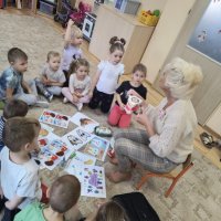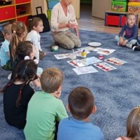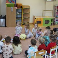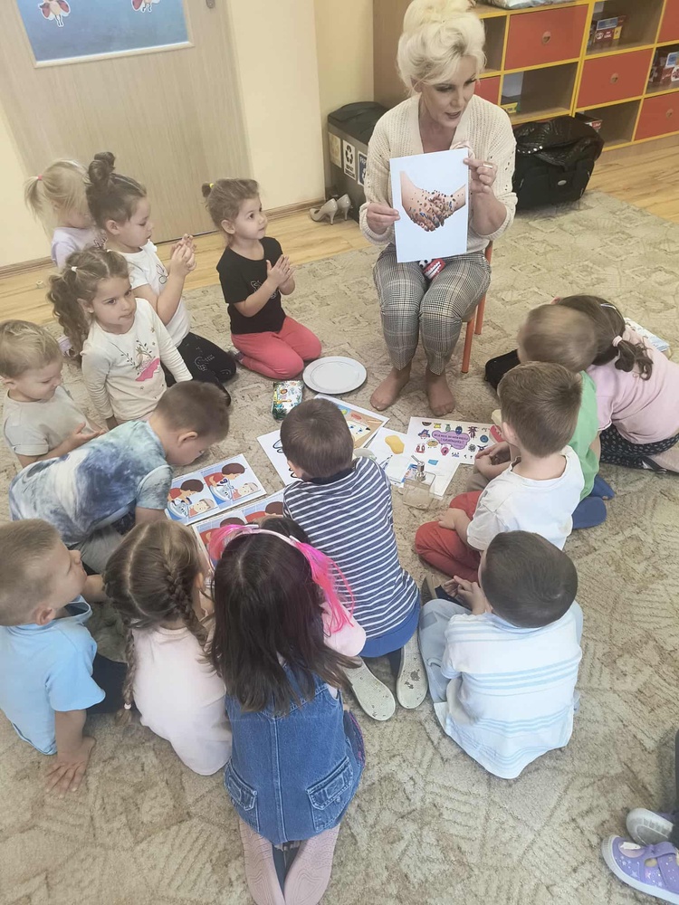 Na początku spotkania Pani opowiedziała dzieciom, dlaczego tak ważne jest mycie rąk - szczególnie przed jedzeniem, po skorzystaniu z toalety i po powrocie ze spaceru. Pokazała także jak prawidłowo myć ręce- dzieci uczyły się ruchów mycia palców, kciuków i nadgarstków.