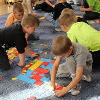 - budowały domy z figur geometrycznych na dywanie – praca zespołowa