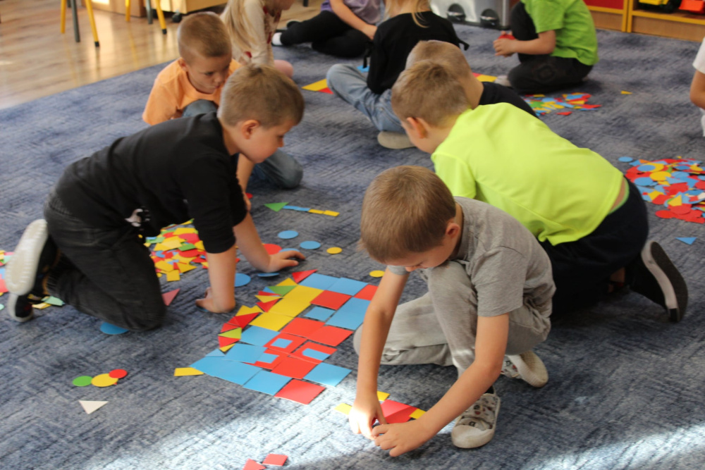 - budowały domy z figur geometrycznych na dywanie – praca zespołowa