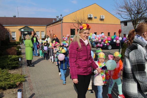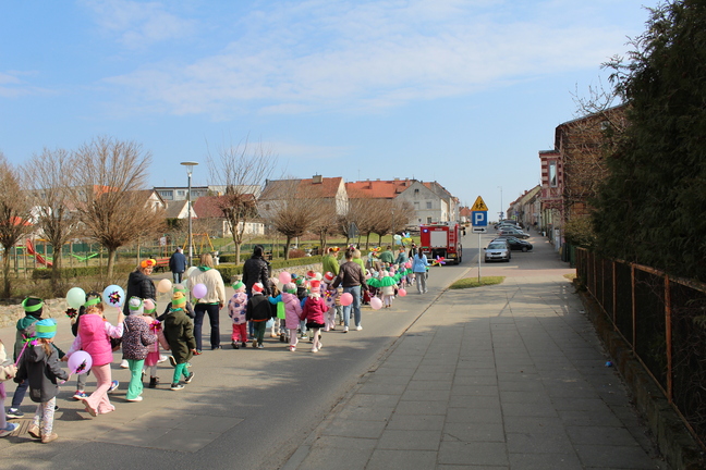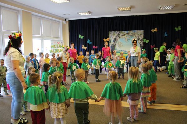 Pierwszy dzień wiosny w przedszkolu był pełen radości, kolorów i wspólnej zabawy. Uroczystości rozpoczęły się od spotkania wszystkich dzieci w sali gimnastycznej, gdzie panowała wesoła atmosfera i słychać było śmiech oraz muzykę. Następnie odbył się kolorowy korowód, prowadzony przez straż, który wzbudził ogromne zainteresowanie i zachwyt najmłodszych.